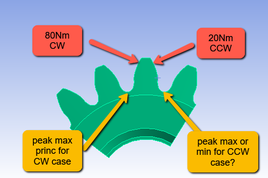 I am reporting peak max principal stress value from the tooth root in the 80Nm CW direction to use as max for mean and alternating calculation, but what should I select for the min, considering that loading in the CCW (opposite) direction? Â