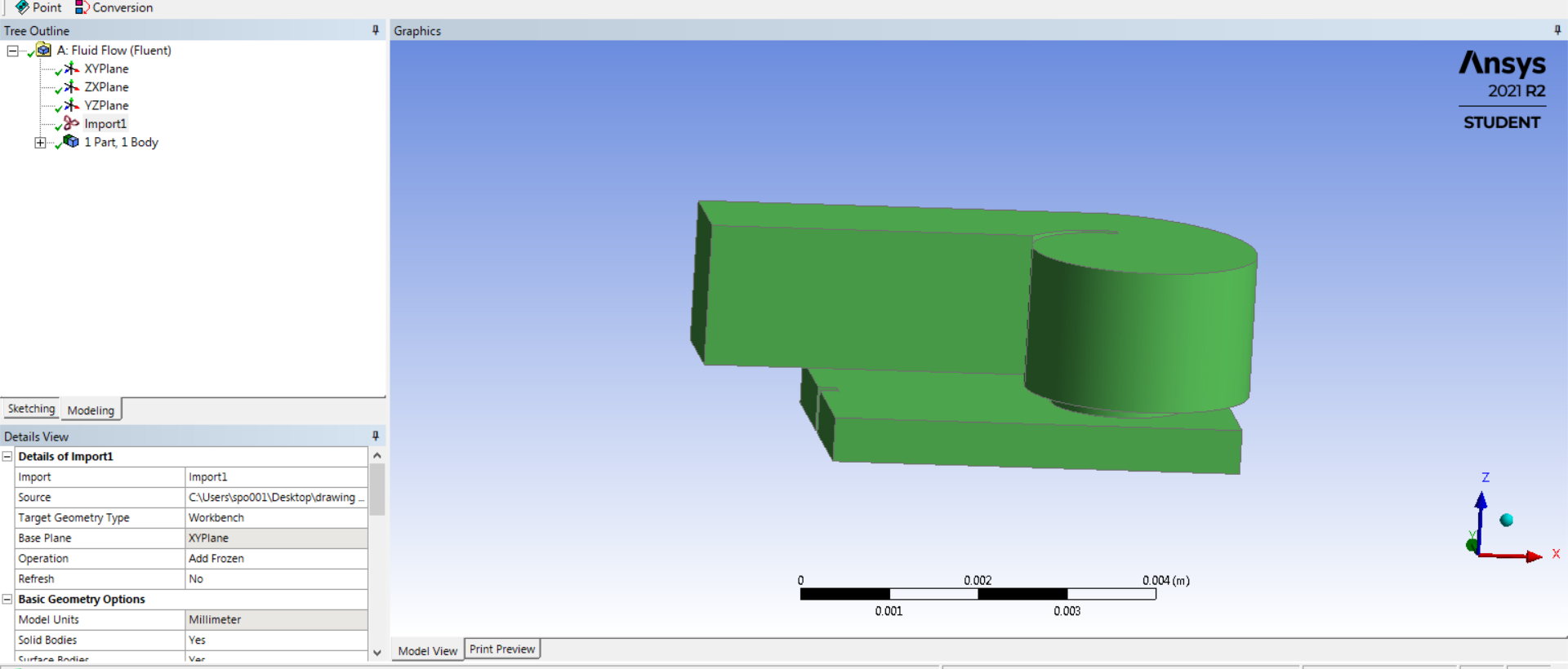 I imported my geometry in the design modeler from AutoCAD. The drawing unit in AutoCAD was in meter. But in design modeler the unit of geometry is showing in mm (for example 1.3 m width is showing 1.3 mm in design modeler). I don't know why is this difference. I selected meter as unit in design modeler also but still my geometry unit is in mm. How can I make it to original unit to m ? The geometry is attached below .Suggestion please