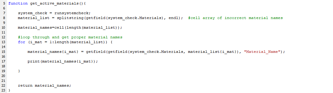 I see a command now called 'runsystemcheck' which returns a struct with the active materials as fields. However I still can't get the individual material names because I can't access struct fields without knowing ahead of time what they are named. Is there a Lumerical Command to get the names of fields in a struct?