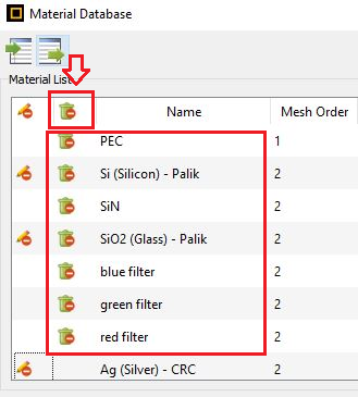 Alternatively, you can use the GUI to find these materials through the database. To do this click on the delete icon on the top. This would place the materials that can not be deleted on the top (since they are in use):