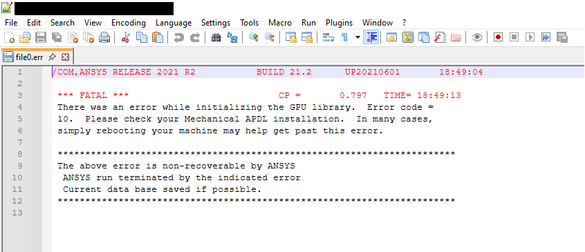 However after following this step, I am still unable to utilise the GPU with MAPDL. On running Ansys MAPDL from the command line with the command ansys212 -acc nvidia -na 1, I am getting the following error message (refer screenshot below) when trying to implement GPU acceleration in Ansys APDL. This error message was stored in the error (.err) log file. I tried searching a lot on the internet, but there was nothing even remotely close to this type of error message (error code = 10) discussed anywhere. I had tried implementing the GPU acceleration for Ansys Polyflow module as well however I received a similar error message (although I have not documented that).
