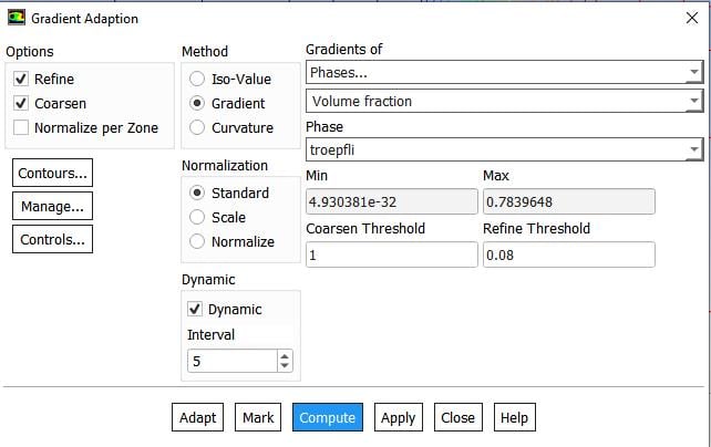 I am trying to simulate the interface between two immiscible fluids using VOF method. In order to capture the interface between the two fluids I am using an adaptive gradient mesh that refines at the interface between the two phases (see Fig. 1). Since the droplet is not always at the same position in the channel, I am also coarsening the mesh. In order to do that, I’ am using the following set-up of the mesh gradient adaptation (Figure1) which works properly.