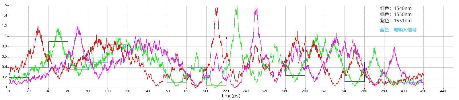 根据该设置方式,最后结果得到的输出波形能很好地反映三个频率之间20ps的时延关系,但是具体的数据幅值却不能很好地输出展示。其结果如下图所示: