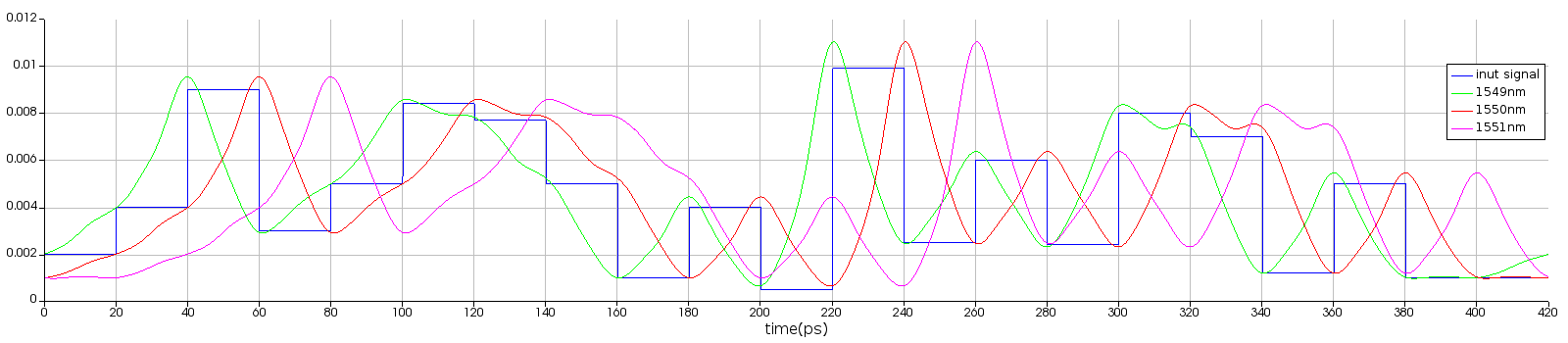 Subscriber老师,您好。我最近在INTERCONNCET中仿真不同的光输出频率下,数据因为光纤色散导致的时延问题。主要是前端利用1549nm、1550nm和1551nm三个CWL产生不同频率的光源输出,并被AM调制成电信号数据所输入的波形(每20ps对应一个输入,一共仿真20个数据)。调制的光信号送入后端线性光纤中,定义其色散为20ps/nm/km,长度为1km,因此三个输入频率在时域输出应相邻间隔20ps(将衰减和高阶色散定义为0,只考虑色散影响)。每一次运行时仅接入一个特定频率的光源,一共运行三次,将结果绘制到一张图上进行显示。所搭建的框架如下图所示: