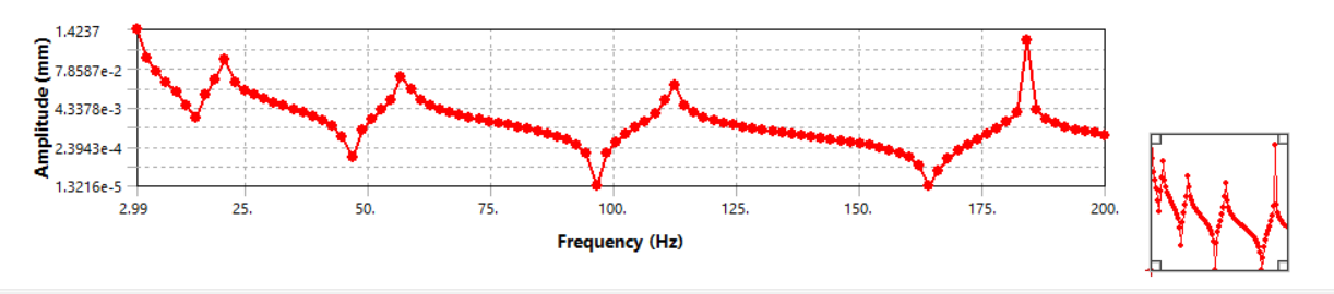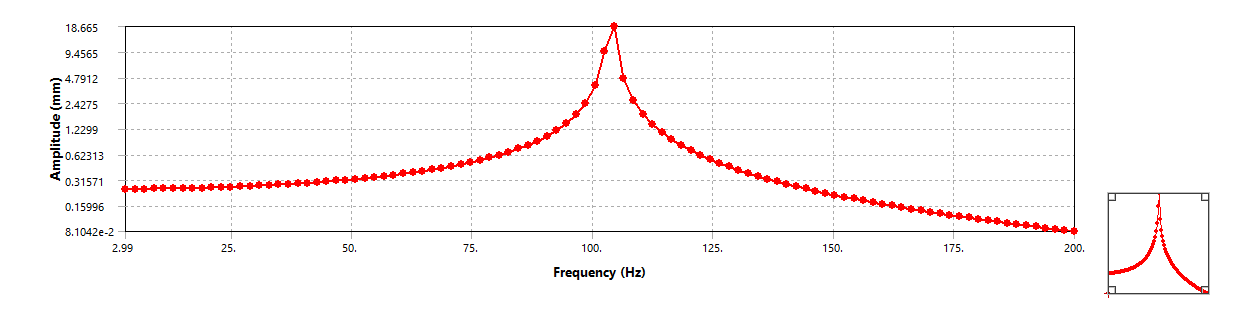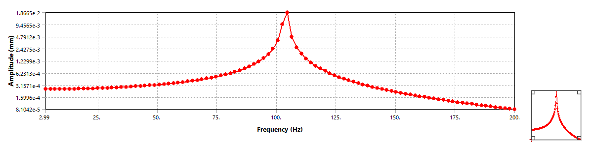 SubscriberStrangely, when I make "emould" 10^3 times bigger to 2.0e8, I got the frequnce response plot with the same resonance frequency, like below, but the amplitude is 10^3 times smaller, as we can see from the plot. I have the same excitaion force, both 10N. Even if I made a mistake for the unit of Emodul, the Amplitude at resonance frequnce shouldn't 10^3 times smaller right?