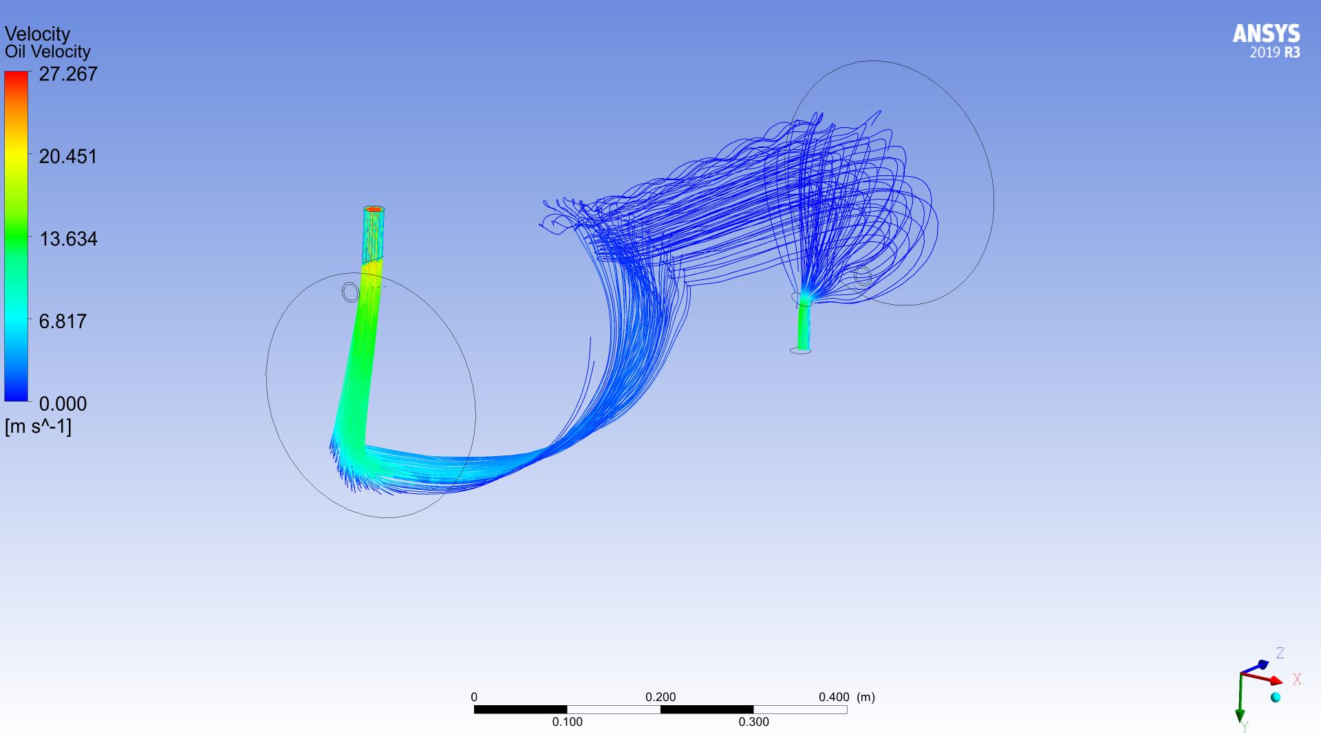 Secondly the mass flow rate of oil which is 9kg/s and water is 4kg/s at inlet boundary conditions. The velocity streamline from oil inlet is almost zero and at water inlet there is some velocity, so i guess water flow is fine but oil flow is not correct. i am attaching the pictures of flow rates and temperature. please go through it and let me know what to do.Â