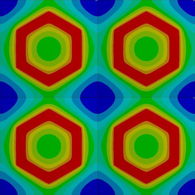 I used "Perfect Insulation" on the four sides to create a symmetry boundary condition to represent what any place that was not near the edge of the mat would look like. If I take my result and copy and paste it 3 times I can get a 2x2 image. Notice that the temperature contours intersect the boundary of the unit square at right angles. That is because no heat is flowing through the plane of symmetry. If I want to see how that is different at the edge of the mat, I could take one side and change that to convection.