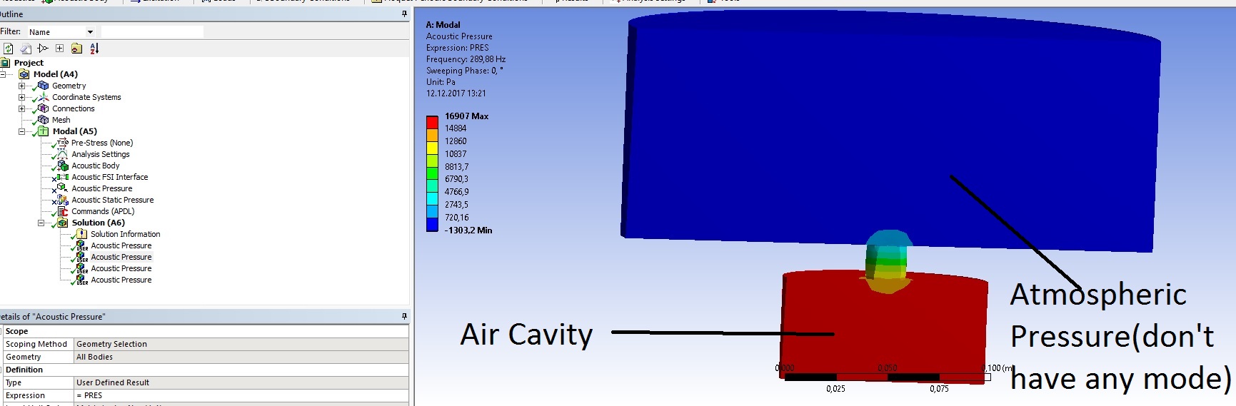 To find Helmholtz resonance, I defined surface of the hole as a 101325 Pa for 1 ATM air pressure condition. but I am not sure if this approach is correct. Because, pressure travel through the neck and in the air. We know neck length but don't know the distance traveled in the air. (l attached SpaceClaim folder (18.0) of my model)