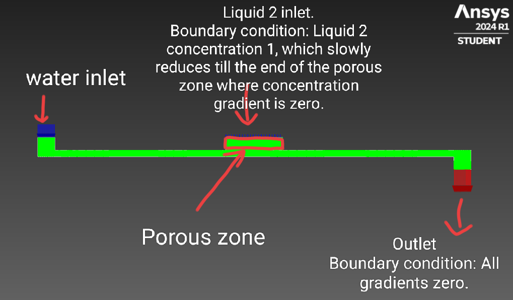 I am relatively new to ANSYS Fluent and currently working on a 2d fluid simulation problem that involves a channel with two inlets and a porous zone. I am seeking guidance on setting up the simulation correctly, especially regarding the concentration boundary conditions for the second fluid.