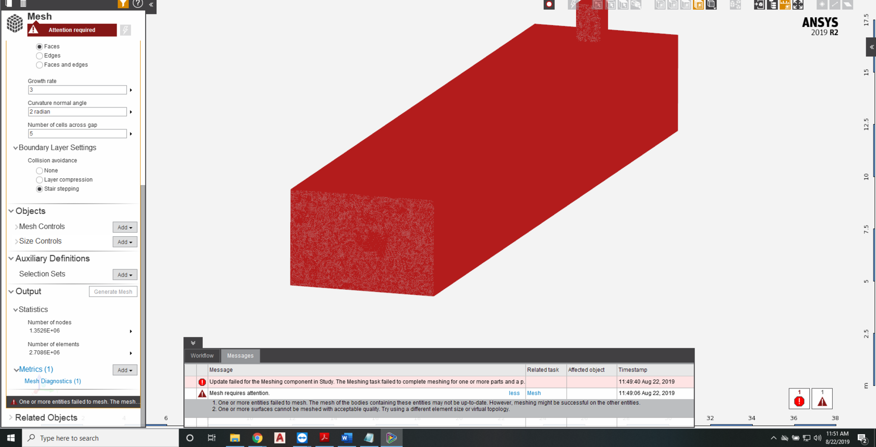 2. While generating mesh, it is important to correctly specify the mesh parameters for generating a good mesh which won't create problems while solving. In one of the latest images shared by you, I can see mesh parameters like Growth Rate =2, Curvature normal angle = 2 radians and, Number of cells across gap = 5. The growth rate value is on a very higher side and such value is not recommended for CFD problems. You may want to reduce it to 1.2 or 1.4. The curvature normal angle is also too coarse which you may want to reduce it to 18 deg or 24 deg. Also, you can go with 3 cells across gaps in proximity regions which will help to reduce the mesh count and generate a good mesh in thin regions. The min size and proximity min size also need to be appropriately defined so that the intended features are properly captured in meshing. Â