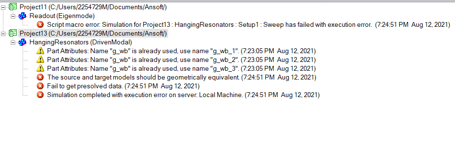 I am trying to import a mesh from an eigenmode solution into a drivenmodal solution. The design is a coplanar waveguide resonator coupled to a feedline. The method I am trying with the drivenmodal setup is HFSS->Analysis Setup->Add Solution Setup...->Advanced->Import Mesh. The current result of the mesh is shown below and the wanted mesh from the eigenmode solution is shown last. I have also added the error I retreive from analys is first below. Any help is much appreciated.