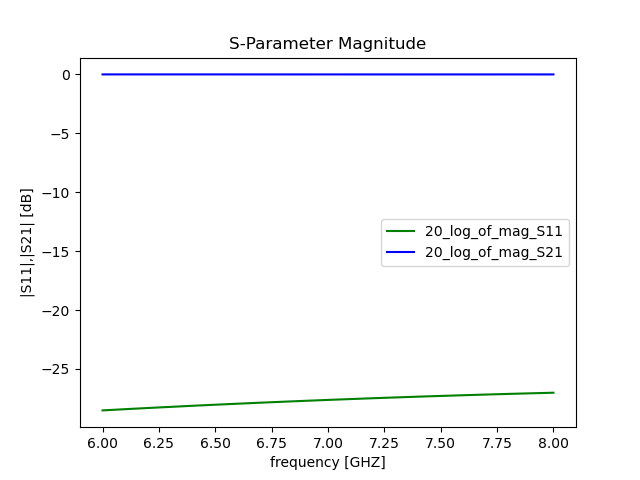 I have attached the resonator highlighted and the S-Parameter results for the driven modal analysis. I am expecting a dip in magnitude at around 7.1GHz , as that is the resonant frequency of the resonator yet there is a flat line for the S21 and S11 parameter.