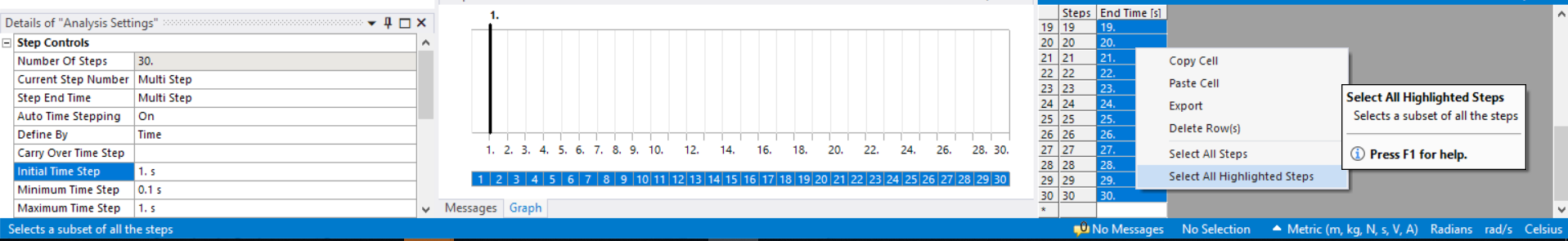If we have the same initial time step, and so on for all the steps defined, the we can select multiple steps on the steps/end time tabular data (just select all rows, right mouse button click and select all hihghl. steps, like shown in the image below). Once we have that we can fill them in and, that will be applied for all time steps.