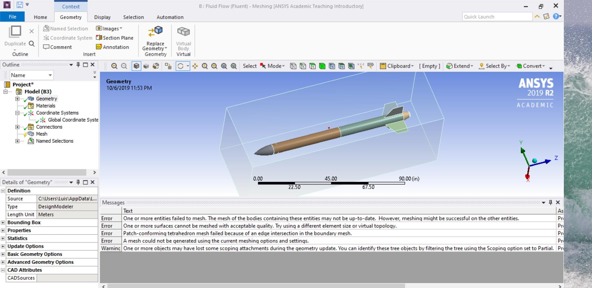 SubscriberThe reason for your mesh error might be intersection of rocket's and domain model. To eliminate this error, open the model in design modeler and choose Boolean>subtract, select domain as target body; rocket as tool body and preserve tool body should be yes. Later then try to mesh. Hope you will now get no error.Â