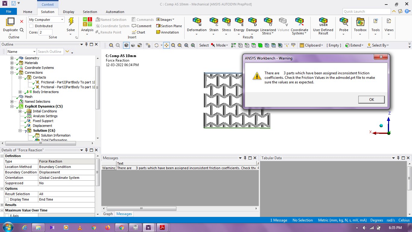 Here I am attaching the screenshot of frictional contact properties sir. Re-entrant honeycomb structure is placed between two plates. Top and bottom plates are flexible (I tried with rigid also, Which stiffness behavior is correct sir?) with structural steel material chosen from material library. Contact body (middle part) is assigned with PLA (Polylactic Acid)(defined multiniear isotropic hardening ) and target body (top plate) as structural steel. Hope I have shared the required details. Thank you sir.