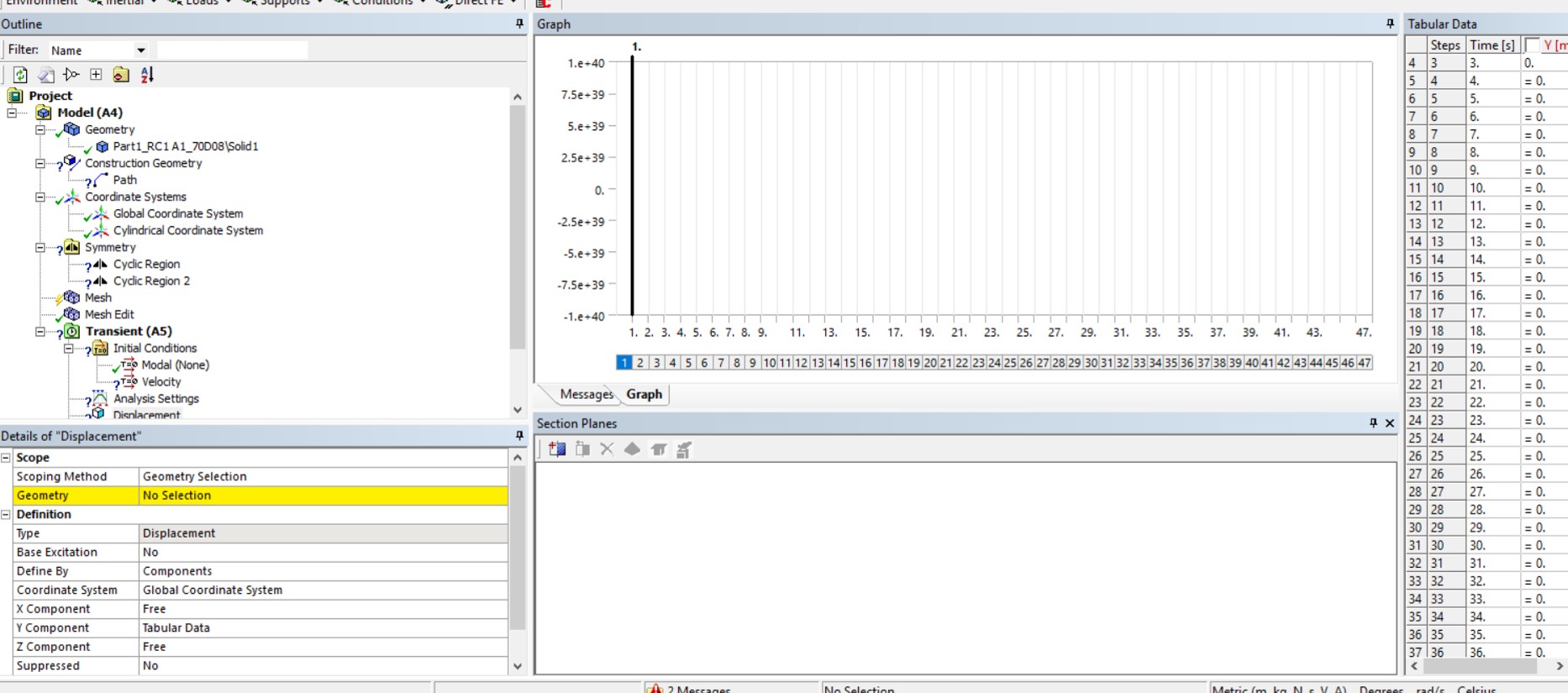 I want to define the analysis settings, which means that I want to input Displacement data for the transient dynamic analysis and Fixed Support on the surface of the model that do not undergo any forces (loads). I have tried to input as Initial condition the velocity to be equal to zero.