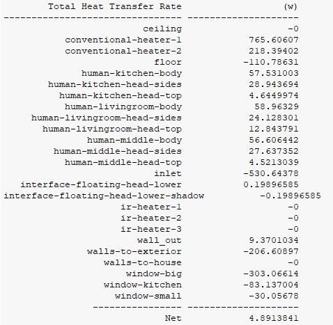On the screen shot with all BCs' heat fluxes you can see some external and internal walls of the room, surfaces of humans' models and some heaters (in this simulation only conventional heaters are turned on). All of these fluxes as reasonable according to hand calculations, except inlet and outlet.