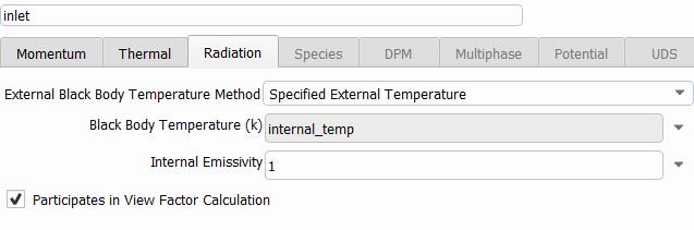 Black Body Temperature for inlet = internal_temp, which is set to 294.15K (the radiation heat flux from the inlet should be close to negligible then).