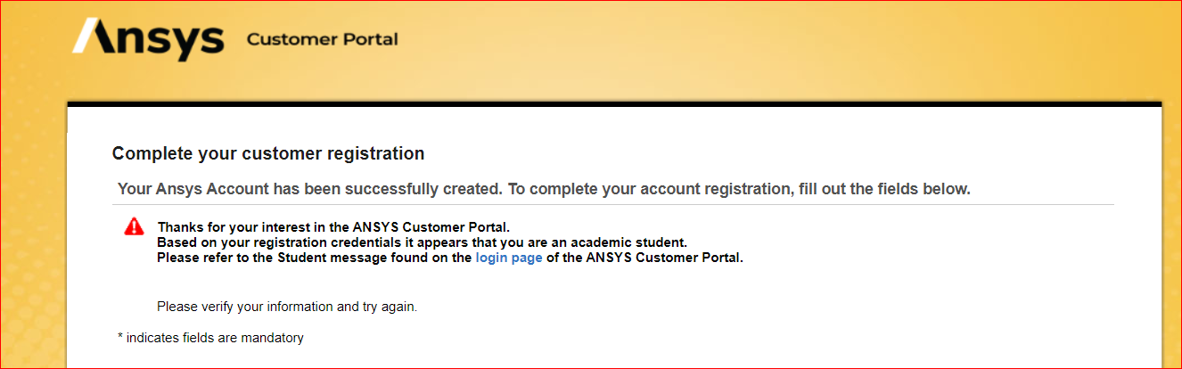 Although, I have created an account at the Ansys Customer Portal using my institute email ID, and the message also shows that I have successfully created an Ansys account. Please find below the screenshot of the same login-page.