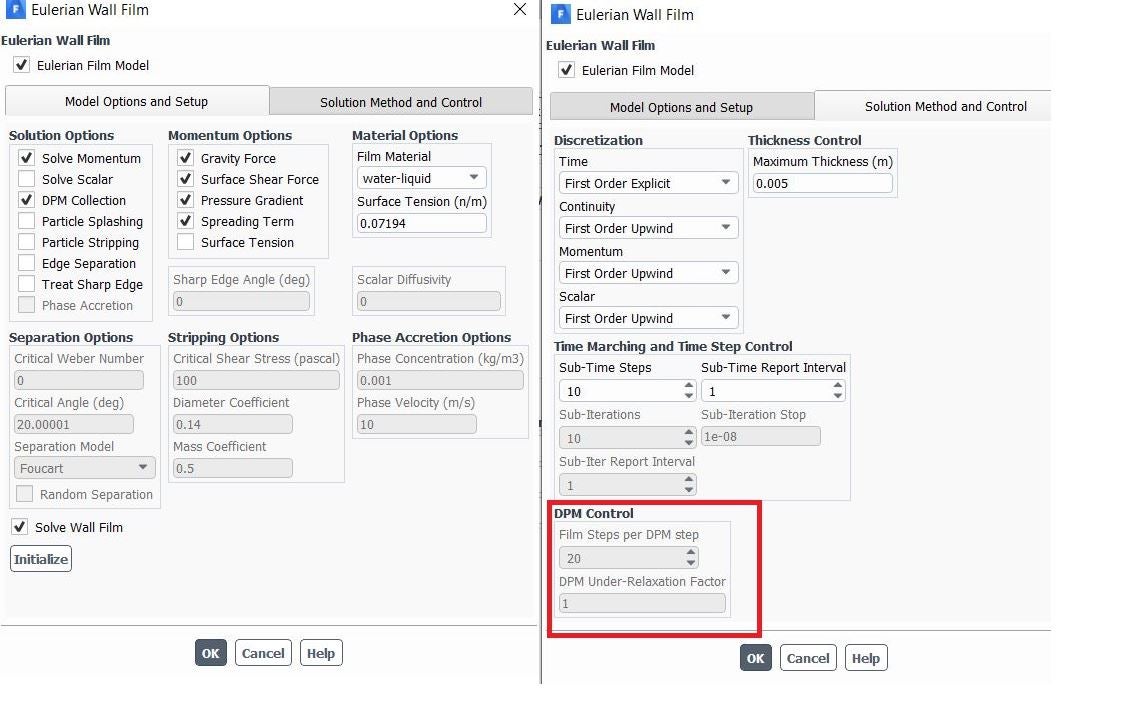 I am trying to activate 'DPM control ' panel. According to ANSYS presentation if I turn on 'DPM collections' in the 'Model Option & Setup' tab , I should be able to activate 'DPM Control' panel. I did this ,but still my DPM Control panel is inactive. I need to set the Film step per DPM step and DPM URF. How can I do this?