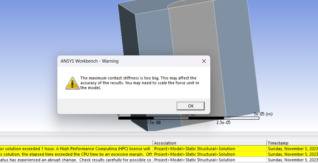 If this is the warning you get, then it gives a recommendation of using a different unit system during solution, which is exactly what you should do. Using a smaller length unit system, such as changing from meter to millimeters, will make the contact stiffness a smaller number by 1E9. The contact stiffness has units with force/length^3, so smaller length values (mm->m) will increase the contact stiffness value. Note that using smaller force unit system (N->dyne) will make the contact stiffness larger. 1e5 dyne = 1 N. So changing unit system from m,kg,N to mm,kg,N decreases the contact stiffness by 1e9, whereas changing unit system from m,kg,N to cm,g,dyne only decreases the contact stiffness by 1E1 (decrease by 1E6 from m->cm with increase by 1E5 from N->dyne). Changing unit system from m,kg,N to um,kg,uN will decrease the contact stiffness by 1e12 (decrease by 1e18 from m->cm with increase by 1e6 from N->uN). The warning is triggered when the initial contact stiffness value is 1E17 or larger.