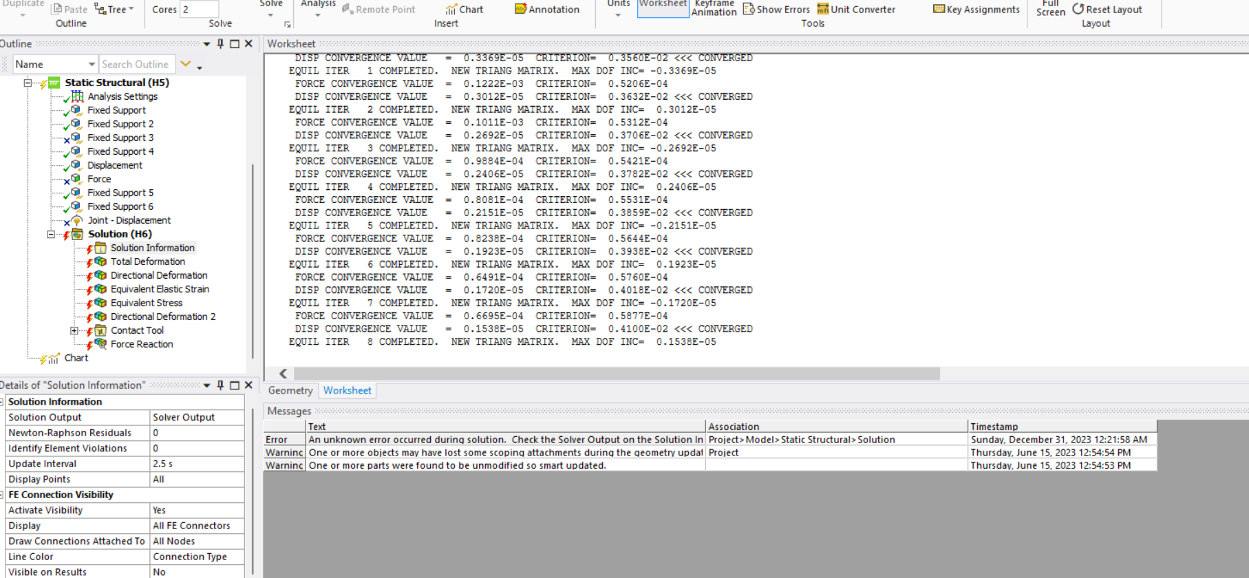 Ansys EmployeeAn abrupt end like that during an iteration with no message is normally a loss of license, or something killed or interrupted the process, like a machine reboot or a user manually killing your processes on a server machine or a 1-user machine where a remote login killed all processes of the current user when the login overrides the current login. Maybe Ansys run is from a served network and you lost network connection.