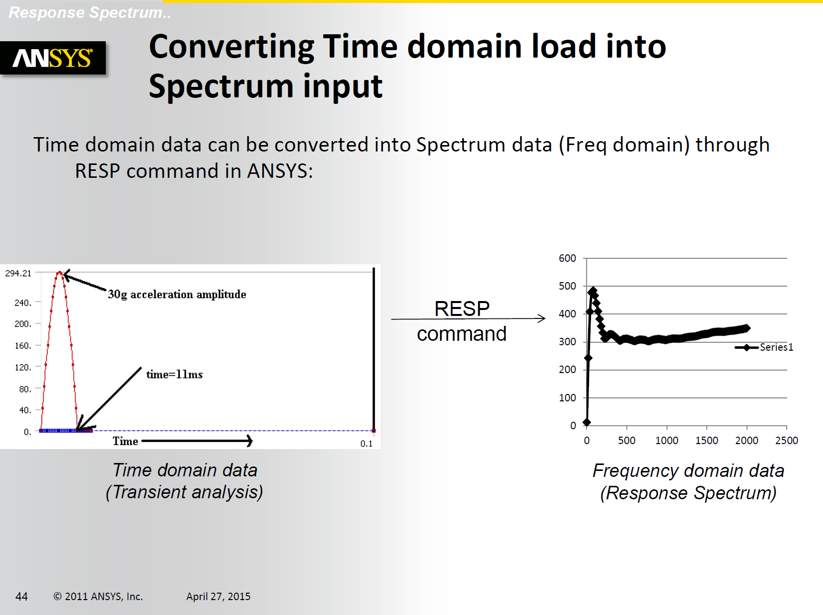 i want to compare the results with transient analysis and response spectrum. the picture says to use RESP Command, but i don't know exactly which command and how to use them. How do i write the RESP command to convert 20g acceleration- time 5ms data into frequency-acceleration data?