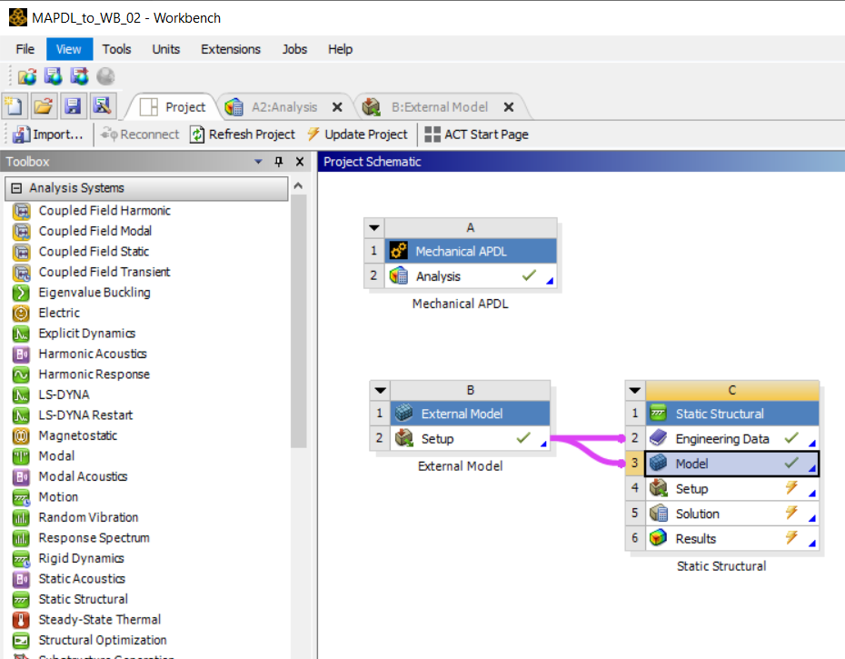 fini/cleÂ/vup,1,z/vie,1,3,2,1Âl=0.100w=0.020t=0.002h=w/2ÂE=2e11nu=0.3uz_tip=-0.005Â/prep7k,1k,2,lk,3,l/2,,hbspl,1,3,2lgen,2,all,,,0,w,0,2lgen,2,all,,,0,0,t,10v,1,2,4,3,11,12,14,13vploÂet,1,185mp,ex,1,Emp,nuxy,1,nuvmes,allnsel,s,loc,xd,all,allnsel,s,loc,x,lnsel,r,loc,z,td,all,uz,uz_tipallsfiniÂ/soluallssavesolvefiniÂ/prep7cdwrite,dbÂÂPlease save the above APDL code to a text file (a MAPDL input file).ÂNow, my WB project page looks like this:ÂRMB on the Analysis cell of System A and add the input file above, and update System A.