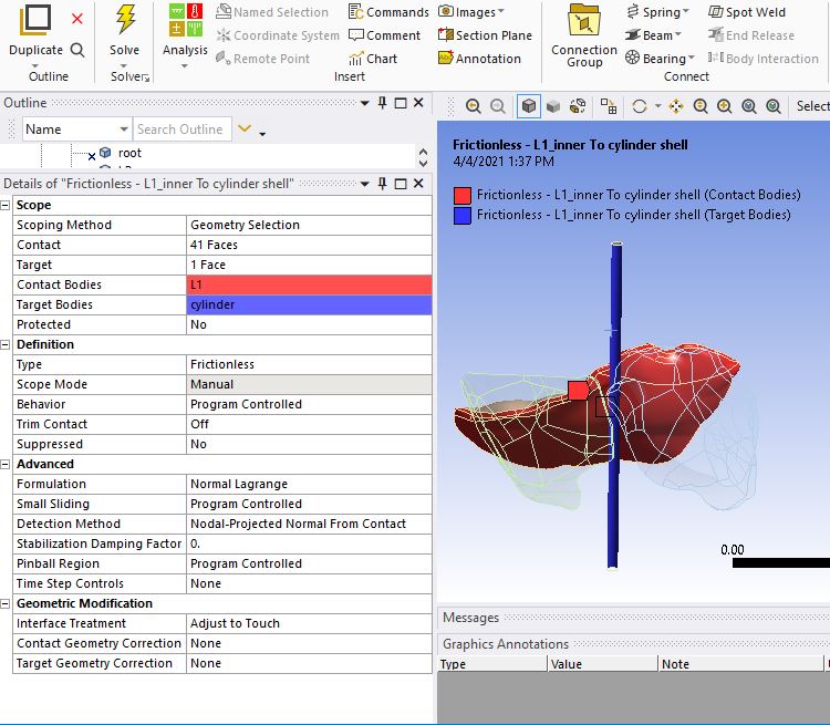 SubscriberHi Kai, I fixed the previous problem. I created a surface (shell) from root faces then gave it a thickness and suppressed root body. I need to expand that cylinder (or balloon) inside the root. The cylinder should push the leaflets as it expands and it should stop when leaflets are open. Cylinder should not penetrate the leaflets or the root. nI am using transient structural. Balloon and leaflets have hyperelastic materials. I’ve tried frictionless, frictional and boded contacts between the cylinder and leaflets. None of them have been successful in moving/pushing the leaflets. Additionally, I used the following settingsnFormulation: Normal Lagrange - allows zero penetrationnDetection method: Nodal-projected normal from contactnInterface treatment: Adjust to touchnSolver type : directnLarge deflection: onnAuto time stepping : onnI tried pressure (0.4 MPa) and displacement (8mm) separately on both the shell cylinder and the solid body cylinder. With a small cylinder (cylinder not touching the leaflets) I was unable to push the leaflets by inflating/expanding the cylinder. But if the cylinder touches the leaflets (like the pictures in my previous post), inflation of the cylinder pushes the leaflets. nWhat do you think goes wrong in the contacts or the setup of this simulation? Thanks!n
