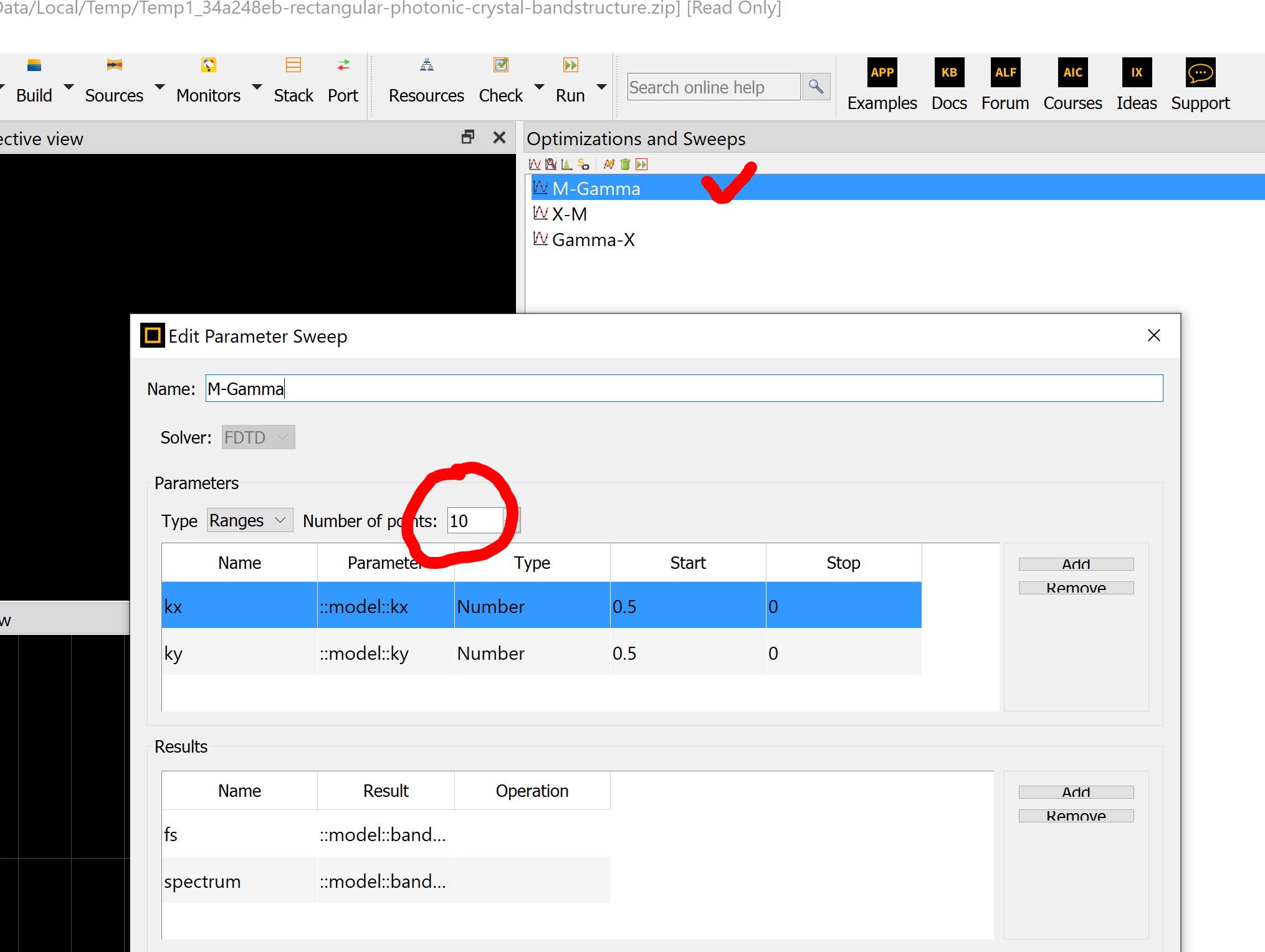 From this example: https://optics.ansys.com/hc/en-us/articles/360041566614-Rectangular-Photonic-Crystal-Bandstructure, I wanna know how to modify my input data (including the setup script, .lsf file... etc) in order to get a more detailed band structure (ie : 100 different k value instead of 30).Â