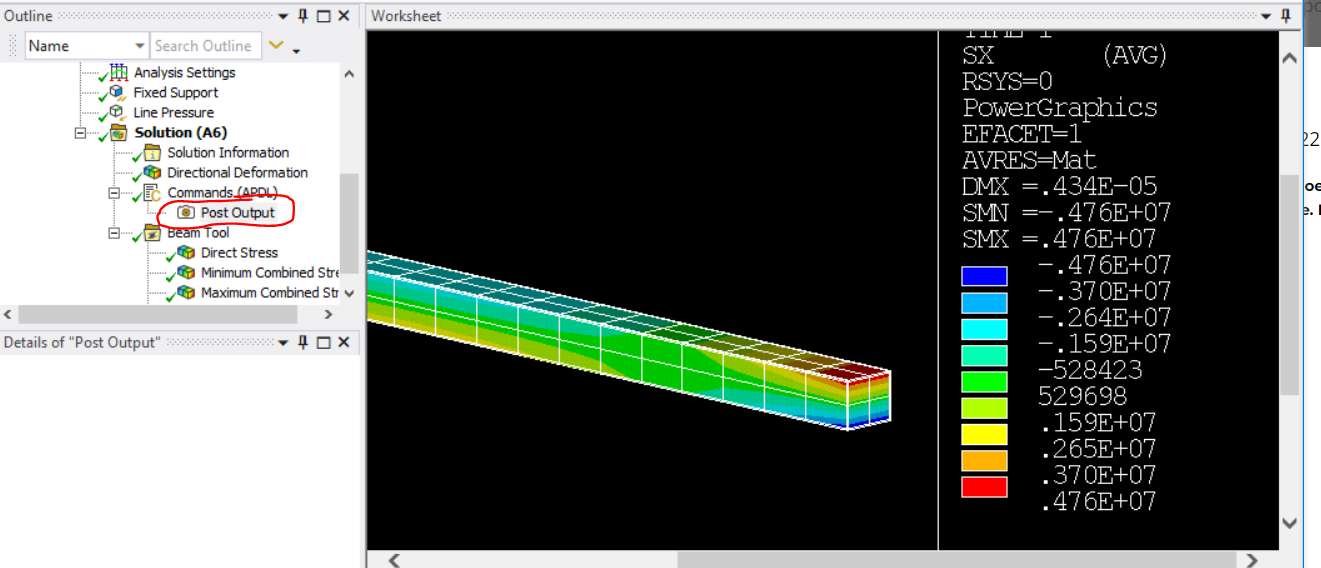 finishÂ/clearÂresumeÂÂ/view,1,3,1,3/graphics,power/eshape,1Â/post1Âset,lastÂÂ/show,pngÂplns,s,xÂ/show,closeÂÂYou can access the image by clicking on "Post Output" under the command object in the tree:ÂÂNote that SX is the stress in the direction of the axis of the element (direct + bending stress) - even if the beam axis is not aligned with the global x axis. The appearance of the displayed stress distribution will be much like that you'd see if you were using solid elements.ÂRelated to (though admittedly not directly addressing)Â your question about shear stress output... one way to specify transverse shear stiffness is with the SECCONTROL command:ÂÂI hope this helps,Bill -