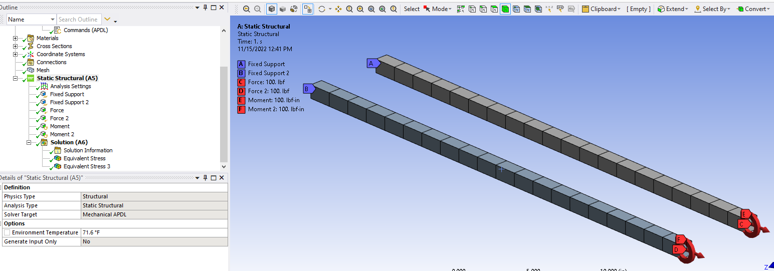 Fixed one end of the beams and load the other with 100lb axial and 250 in-lb moment about global z.