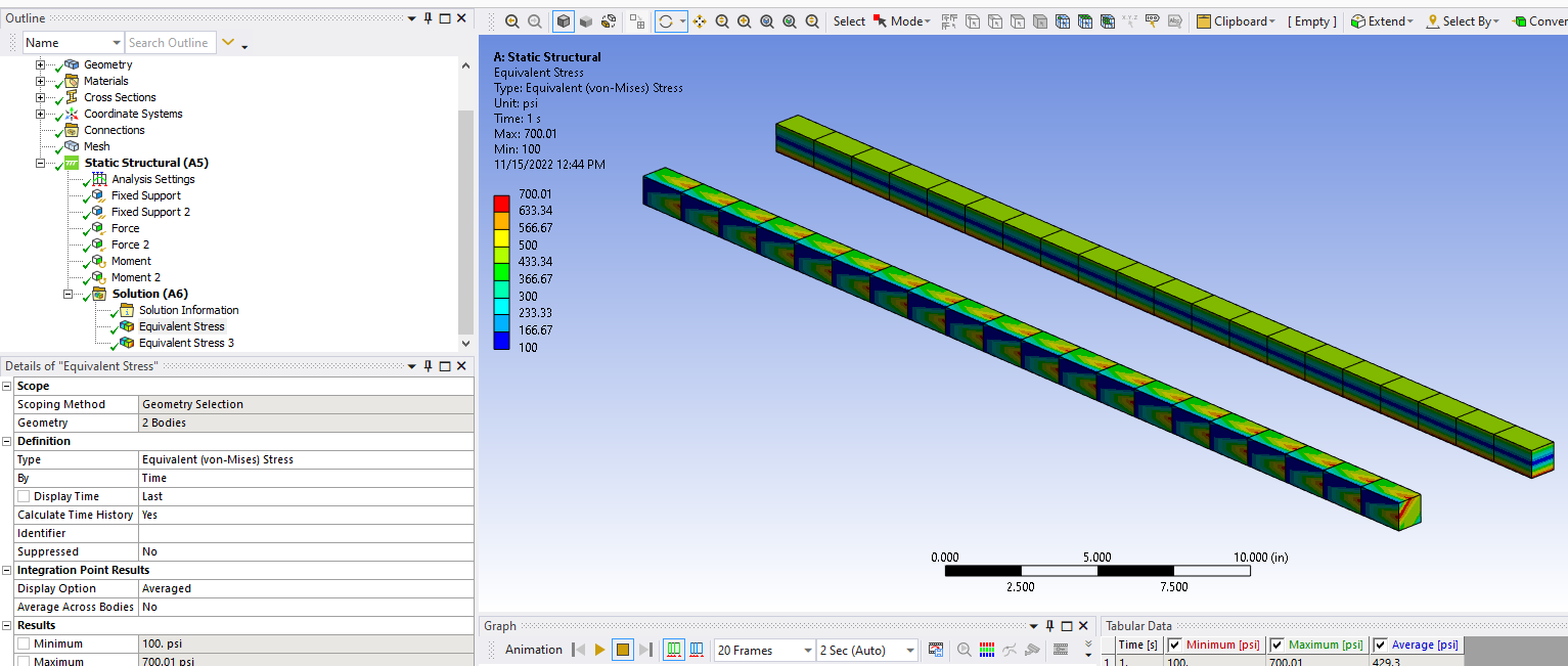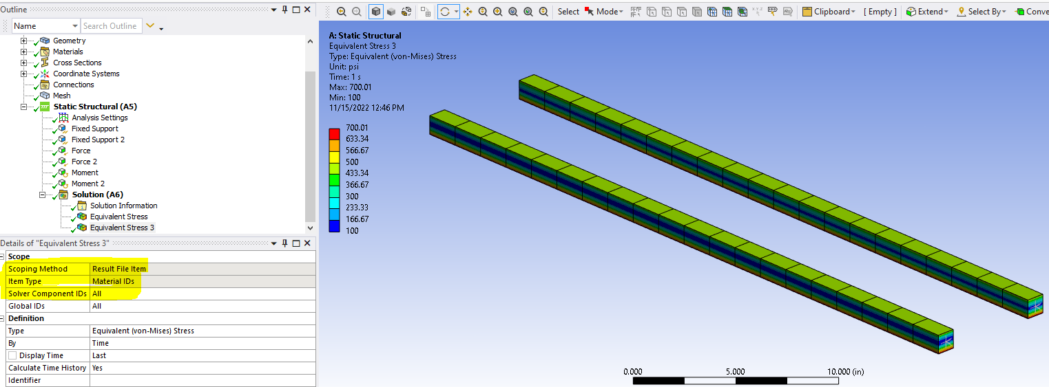 We can see that the beam in the upper right is correct (default section mesh) and the one in the lower left is not (CO to change section mesh). This is expected as Mechanical thinks beam 2 has 9 section nodes whereas it has 49. Instead post-process by Material ID so it's a more direct read/presentation of the results: