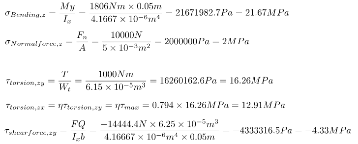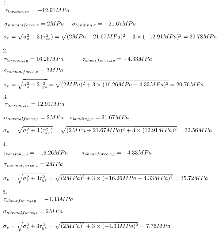 Hand calculated beam’s cross section’s von Mises stresses at point C at cross section’s 5 different locations: