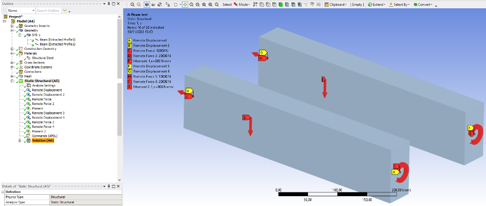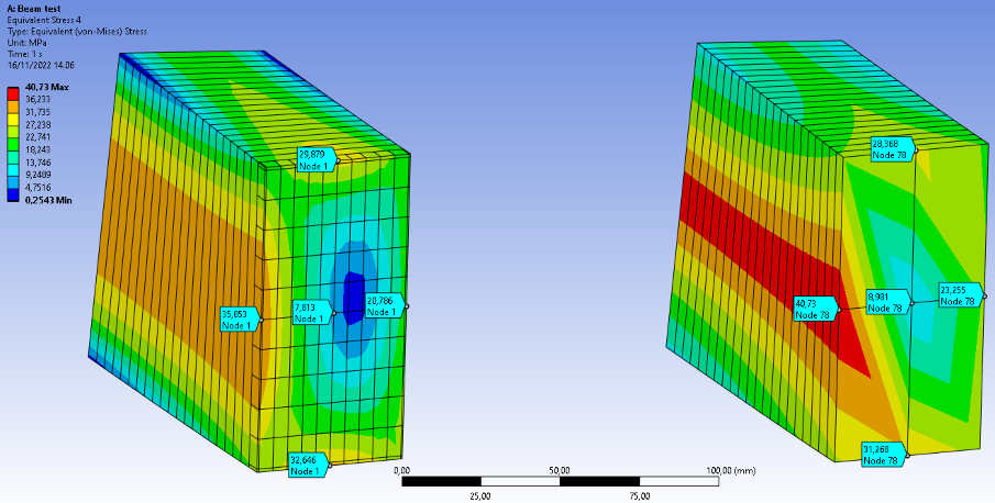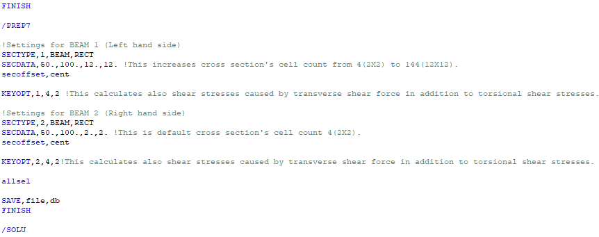 So we can see from the left hand side beam that it was necessary to add this APDL command object to achieve more accurate results by increasing cells in cross section and taking in account transverse shear stresses caused by shear force in addition to torsional shear stresses.