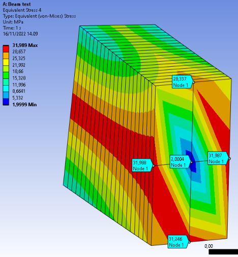 Here are the von Mises stress results at point C with default Ansys Mechanical’s settings for BEAM189 without any APDL command object: