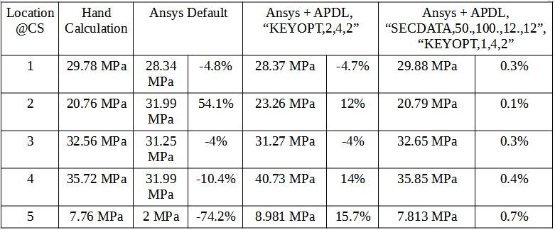 Here is a summary for the von Mises stress results and Mechanical’s results difference to hand calculation: