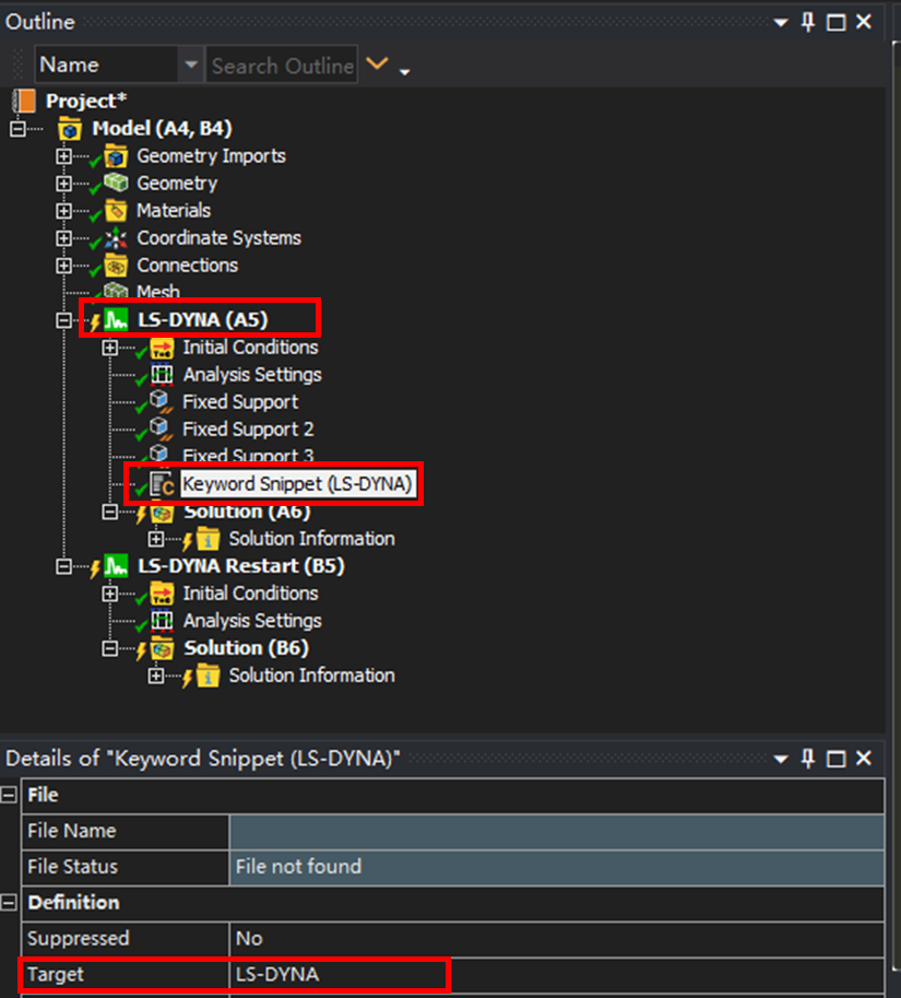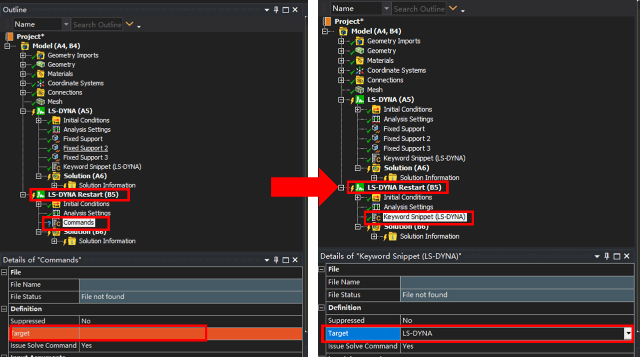 In Workbench, when adding keywords with Command in LS-DYNA, its SolverTarget property is automatically assigned to LS-DYNA (as shown in Figure 1).