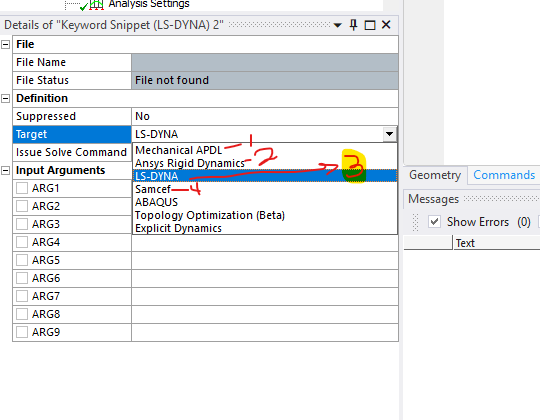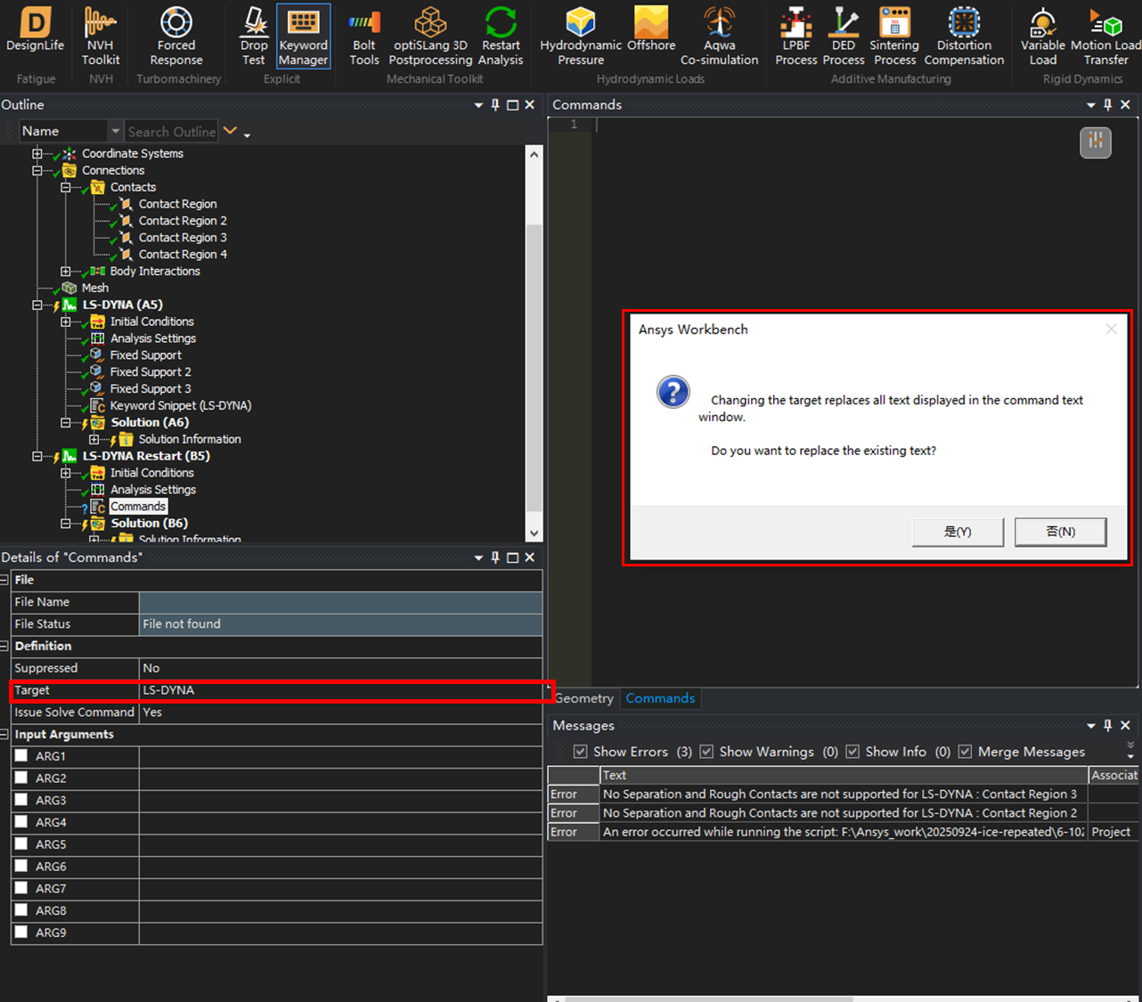 However, when using Command to add keywords in LS-DYNA Restart analysis, the SolverTarget property needs to be modified manually (as shown in Figure 2), and this operation is not recorded in the script (as shown in Figure 3).