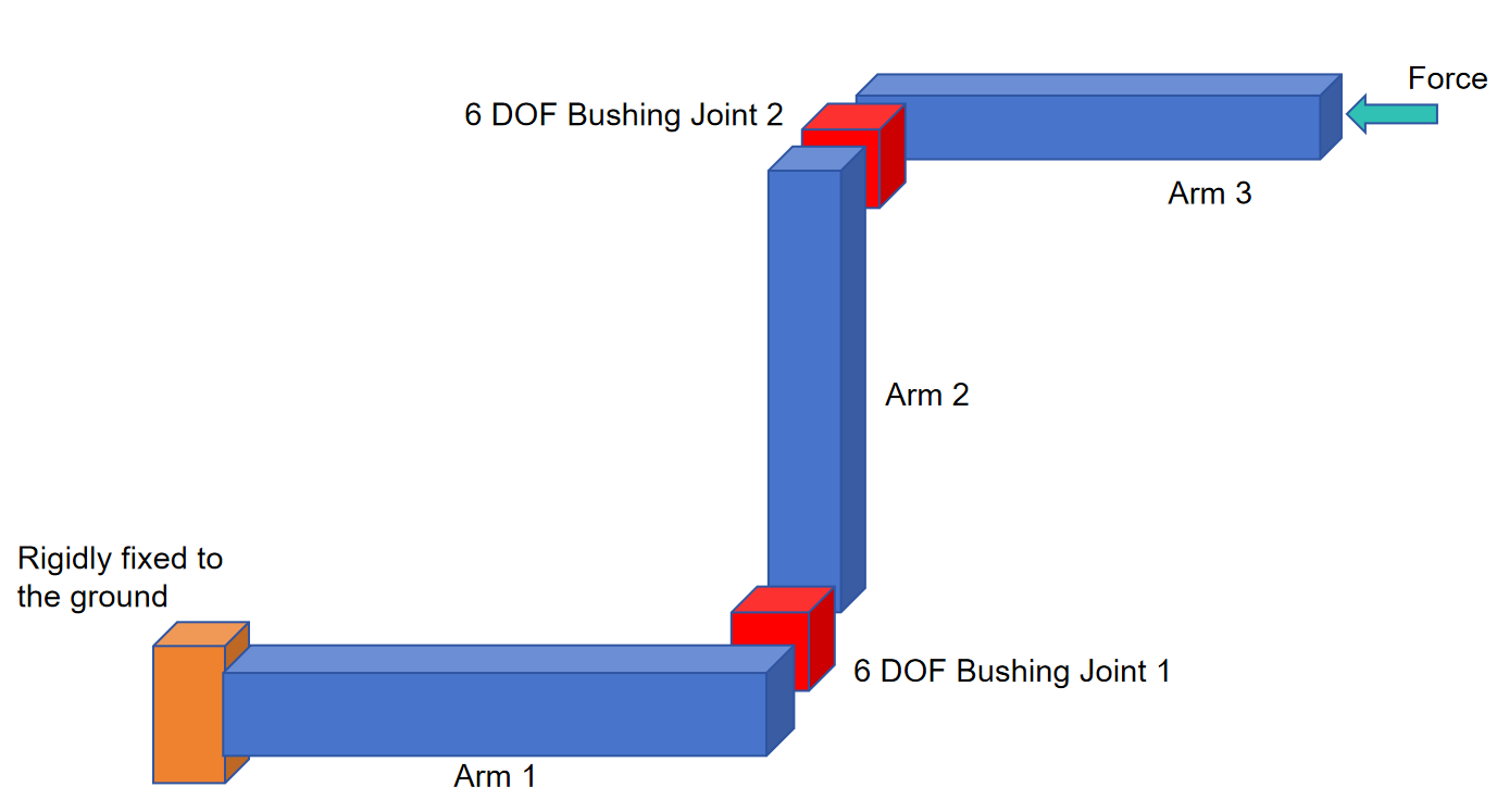 Here is my scenario (see figure): I want to place bushing joints between Arm1 and Arm2, and between Arm2 and Arm3. Arm1 is fixed to the ground.