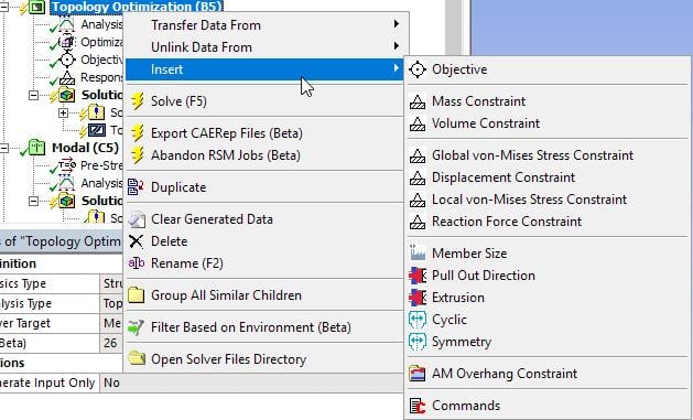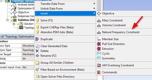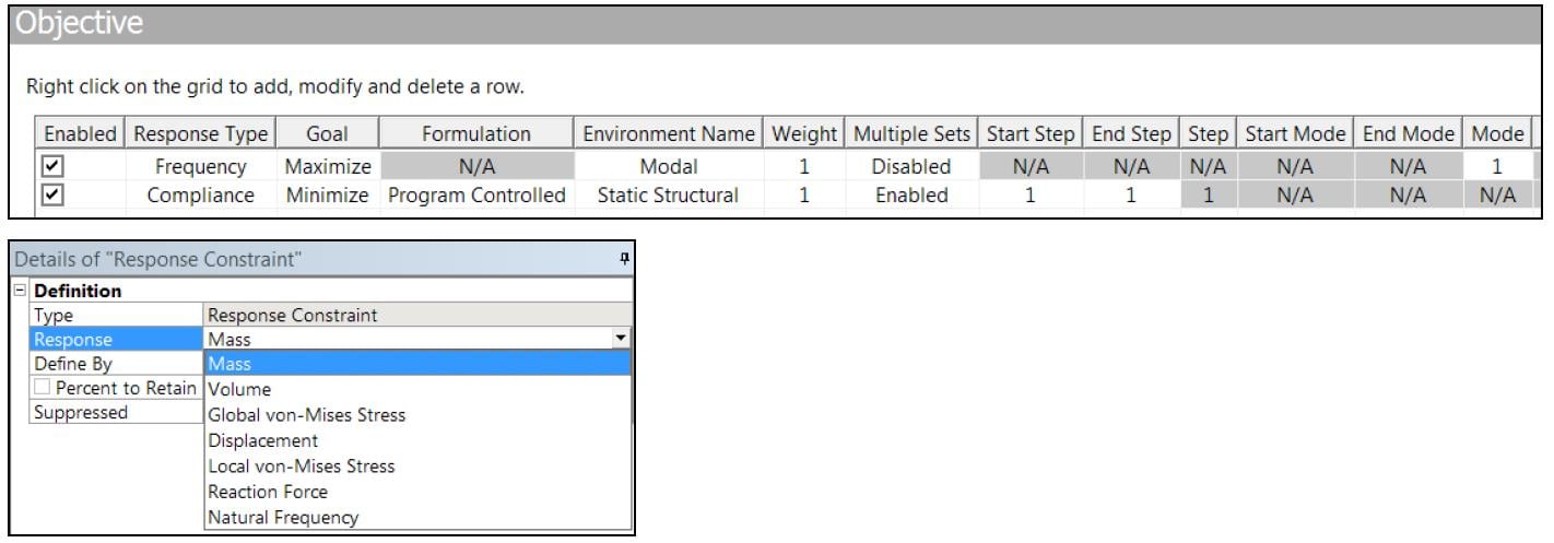 Ansys EmployeeYou can set up different response constraints by right-clicking on the Topology Optimization Cell in the structure tree. For Static Structural you would have: