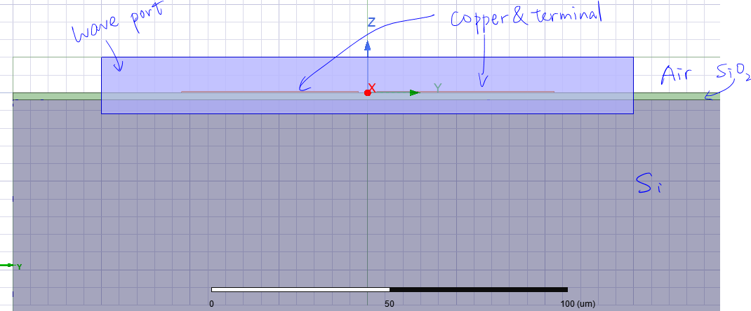 2. My ultimate goal is to design a pair of ground-signal (GS) electrodes (sub millimeter level) on the chip with a frequency range of around 0-20GHz. The substrate of the chip is silicon (hundred um level) and silicon dioxide (um level), as shown in the schematic diagram below. Therefore, there are electrodes and two substrates within the range of microwave wavelengths. How should I set waveport and terminal to obtain the correct results? Should the size be set to about ten times the electrode width or spacing, as in CPW, or should it be set to near the wavelength level?
