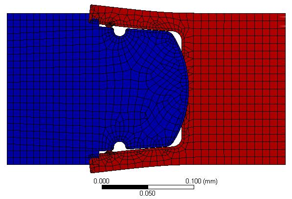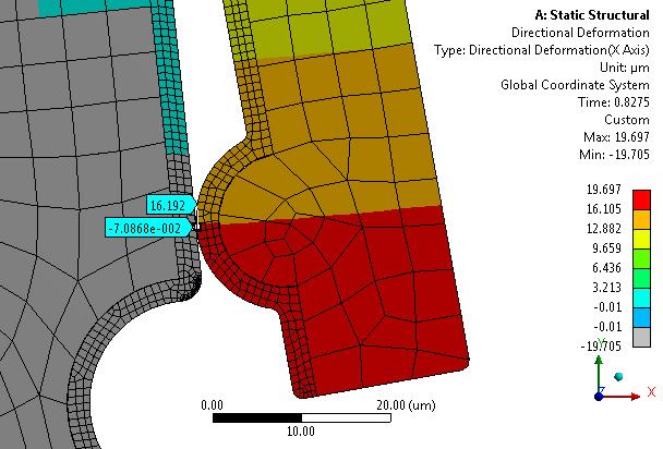 Step 2 had too short of a displacement, so it failed and I made it larger. I also wanted to cut the simulation time in half again. Look at the deformation in the clip. It is 16 micros in the X direction while the plug has only moved -0.07 microns in the X-direction. This is good evidence that changing the plug to a rigid body will not incur a significant error in the clip stress.