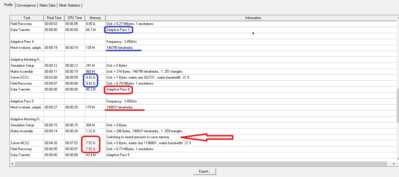 I am simulating the same structure using two different PC to check if the results are same. The two PCs are: a laptop with 12GB RAM, and a desktop with 32GB RAM. I noticed, in desktop, it takes ~ 19 -20GB memory to solve 6 adaptive passes of the structure at 3.55GHz. However, in laptop, it takes only ~9 GB memory to solve 6 adaptive passes of the same structure at 3.55GHz. The results are also not same.