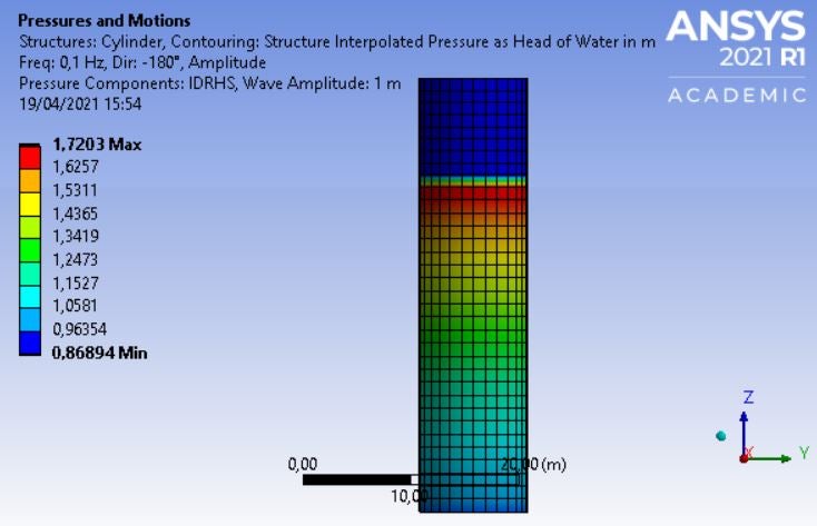 SubscriberHello there.I am simulating a simple cylinder in regular waves (frequency domain) in AQWA - Hydrodynamic Diffraction. Here's a picture of the resulting pressures around the body: