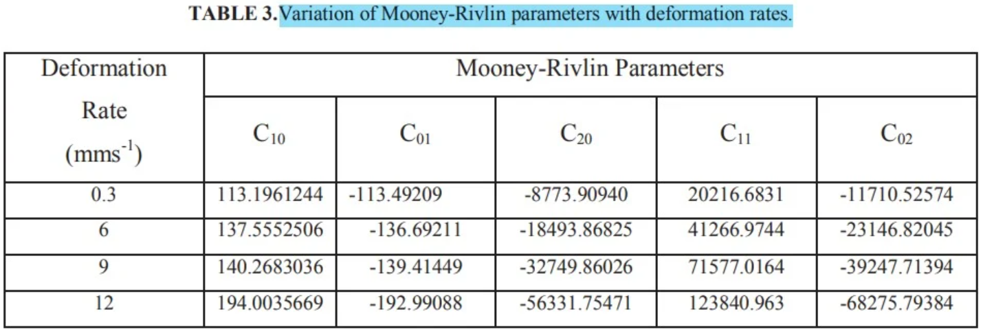 I need to use the 5 parameter Mooney-Rivlin model to simulate the hyper-elastic behavior of the human ACL. I've found a related article, which describes the model constants. Here is a picture indicating the table of coefficients: Â https://drive.google.com/file/d/1s2rwXOtdA8km24B52031RqN7wNZLEguU/view?usp=sharing