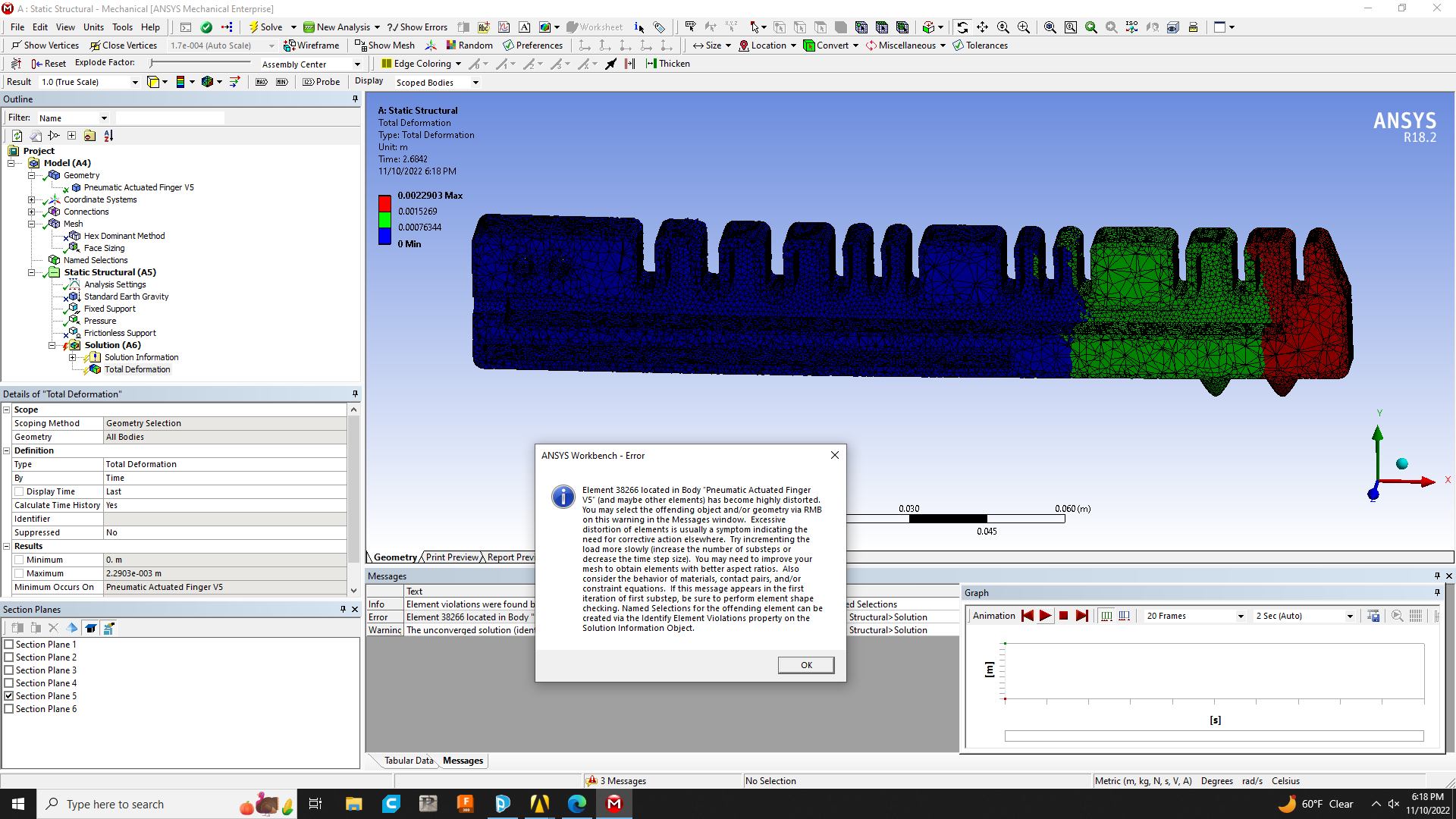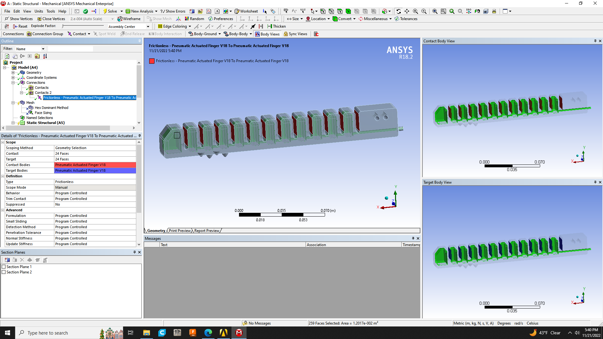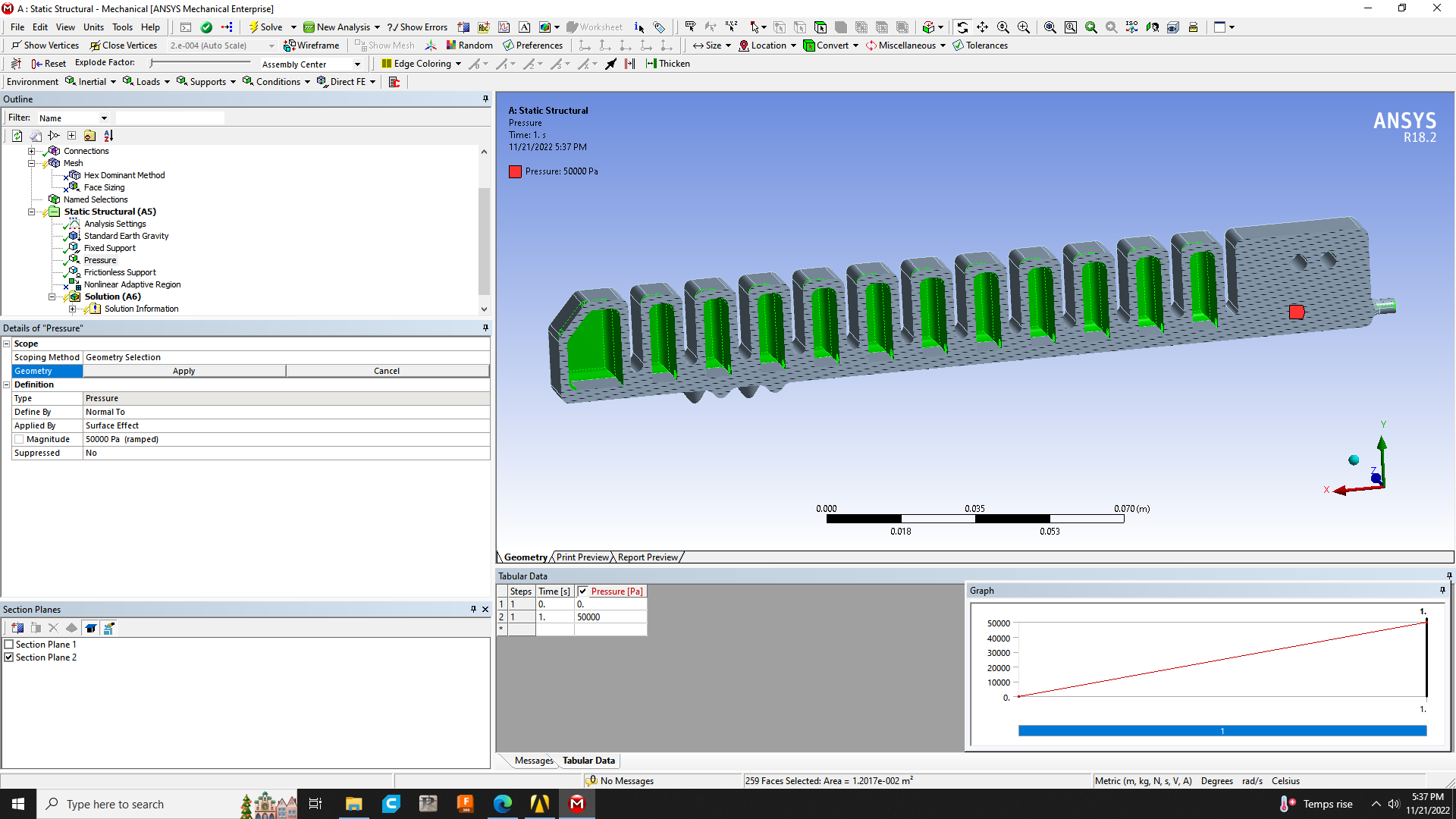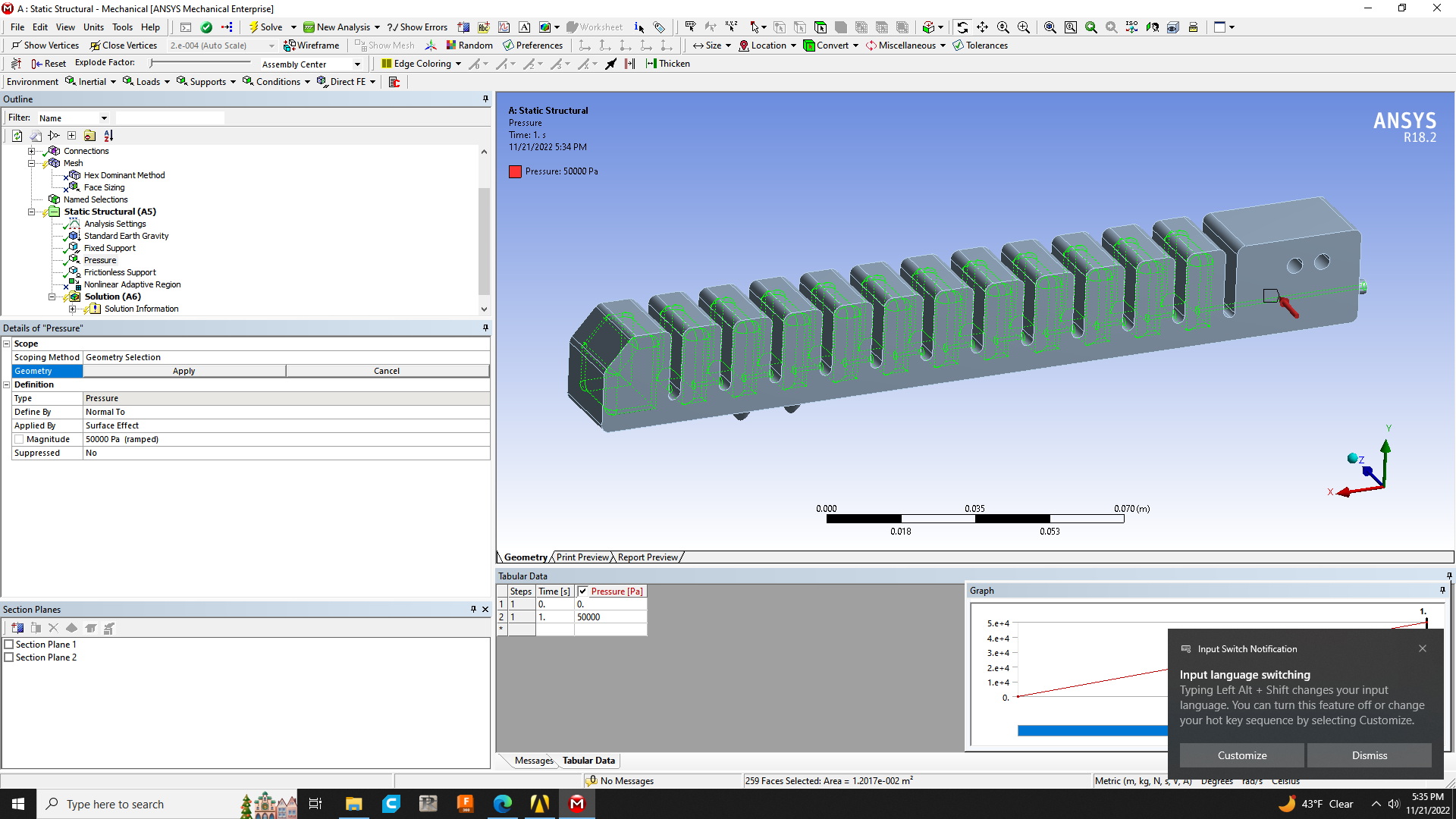 Physics preferences are already set to nonlinear mechanical with quadratic setting. In addition I have put a face sizing method and set element sizing to 0.001 m. Is this fine?