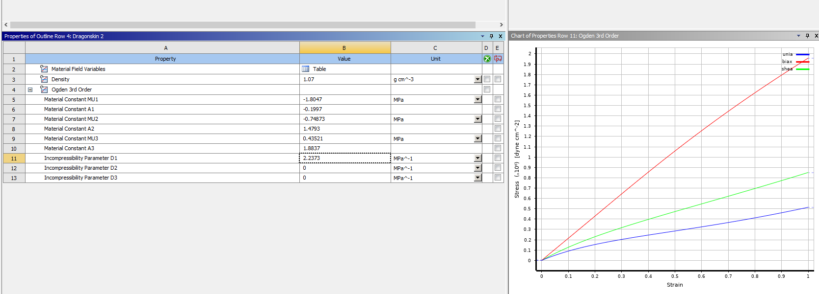 SubscriberI have been trying to simulate a hyperelastic model made from DragonSKin 10 with the following properties being put in Ansys: