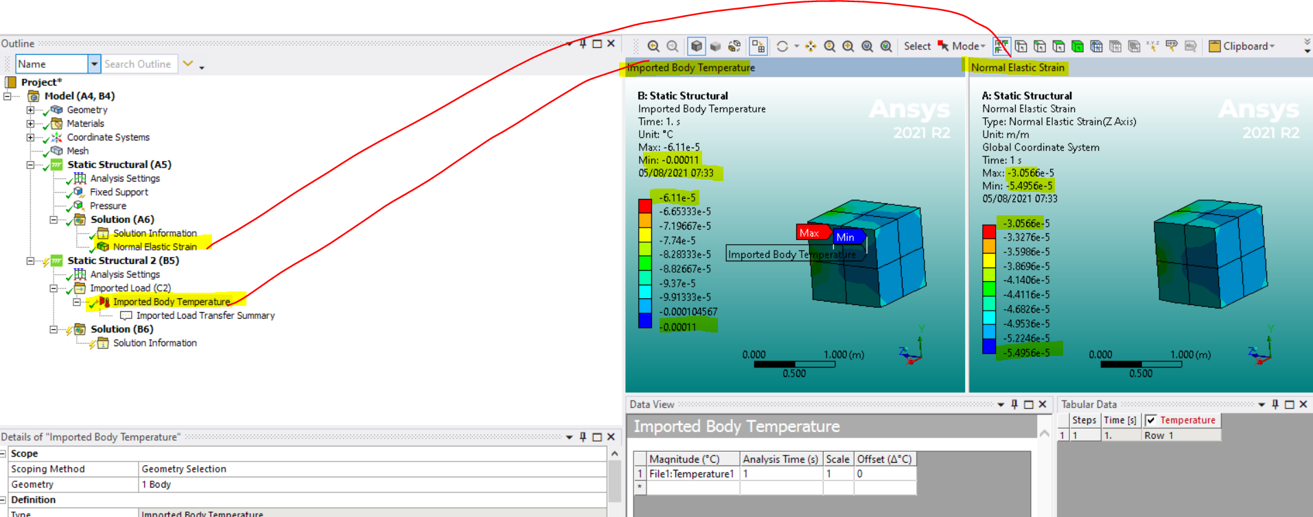 finally import the loads - as we can see the left result (imported load) shows twice the strain as it should