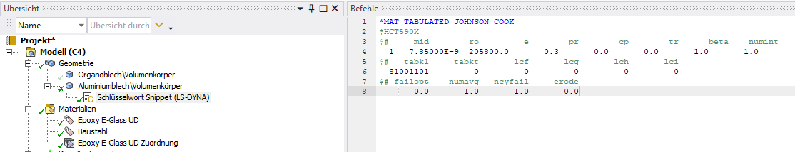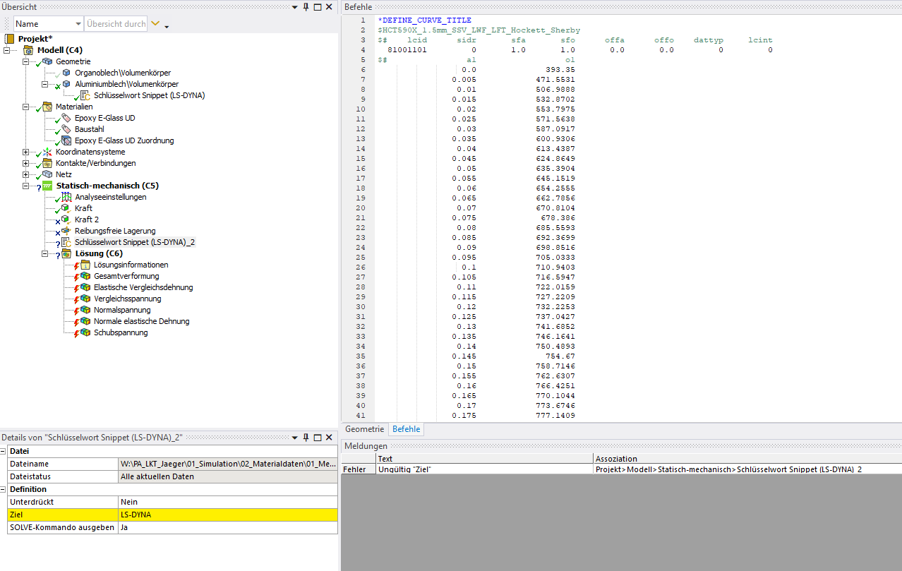 When I try to insert the curve like the *MAT within the geometry, the job starts. But the Keyword Snippet and so the curve is not considered. The solutions are the same as without the Snippet.
